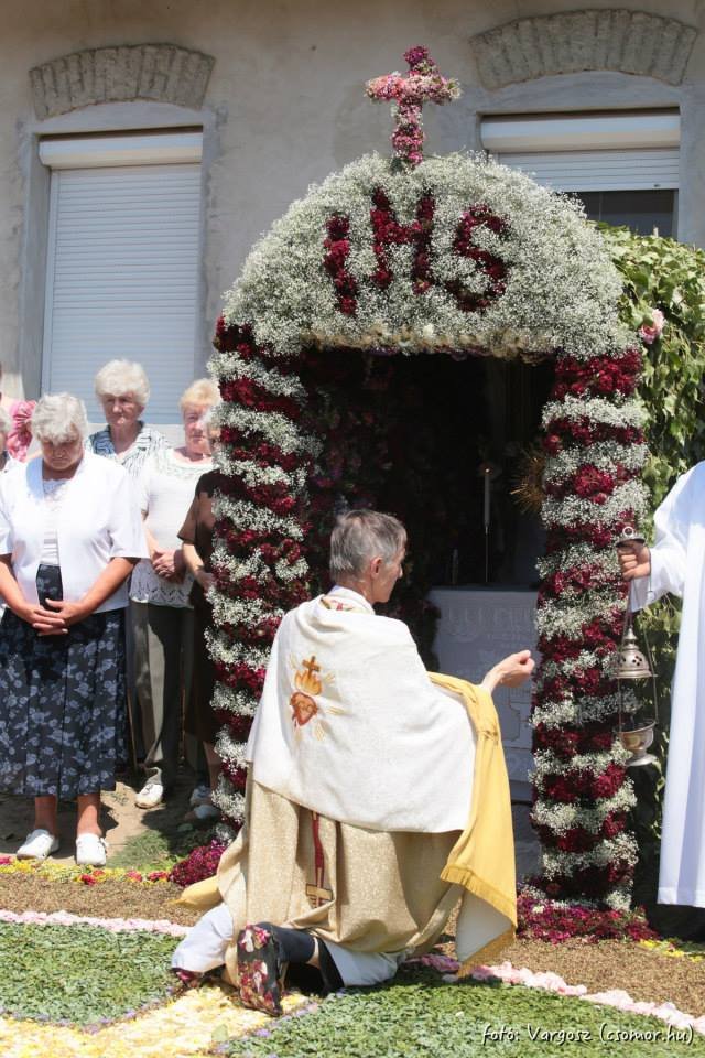 A négy utcán keresztül haladó, kb. 2 km-es virágszőnyeg virágainak egy részét vásárolják, a többit pedig a kertekből, mezőről gyűjtik. Négy kaput is készítenek, egy-egy kapuhoz összeállításához kb. 1300 szál szegfűre van szükség. Az összefogott munka eredményeként az ünnepi miséig össze is áll a szőnyeg. A mise után indul a körmenet, a pap vezetésével a hívek végig mennek az úton, a kapukál megállnak és imádkoznak.