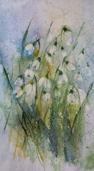 Február elején a kertészkedők már nagyon várják a tavaszt. Minden kis apró jelnek, kis előbújó hajtásnak örülnek. Az idei kemény tél miatt hosszabb a várakozás. Még a hóvirágok is késnek. Kivéve a festővásznon.