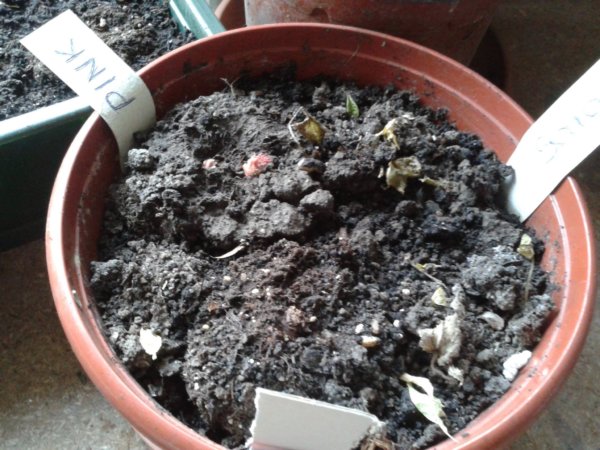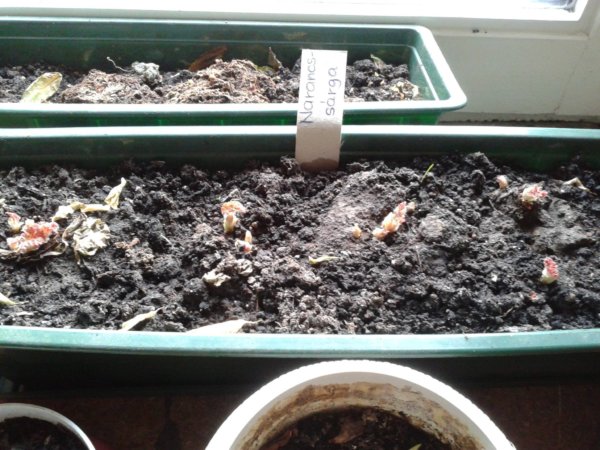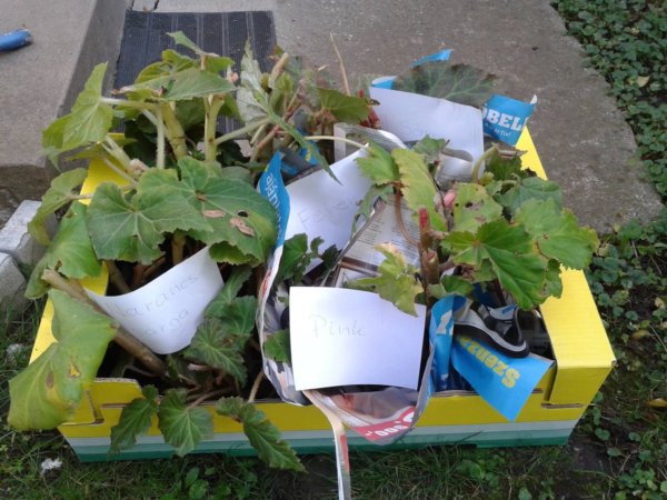 Október vége felé, még a fagyok előtt kiszedem a gumós begóniákat a földből, és egy dobozba rakosgatom a visszametszett növényeket. Nem vágom le teljesen a zöld részt, 10-15 cm-t hagyok rajta, ami idővel magától leszárad. Megjelölöm, milyen színűek, hogy a tavaszi kiültetésnél vegyesen kerüljenek a földbe.