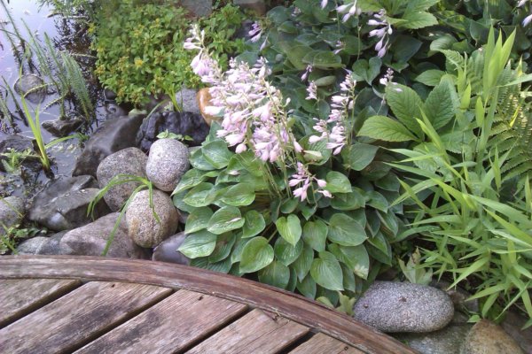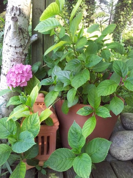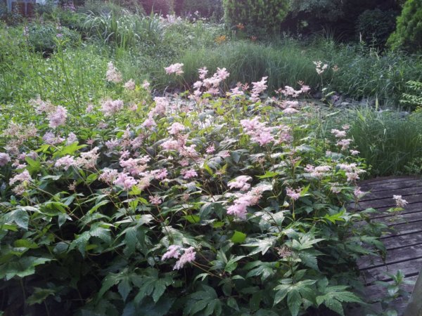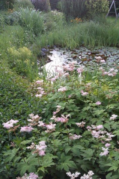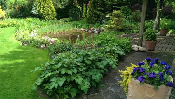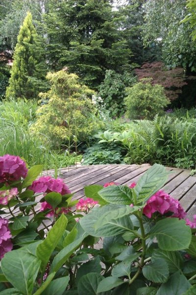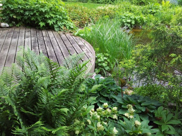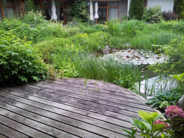 A stég partjánál páfrányok, Tópartifű (Rodgersia), Hunyorok (Helleborus), Kínai Szellőrózsa (Anemone hupehensis), Erdei tündérfürt (Aruncus dioicus), cserepekben Hortenzia (Hydrangea) nyílik.