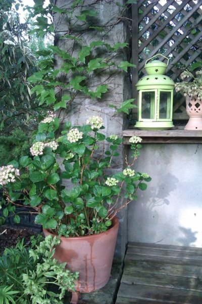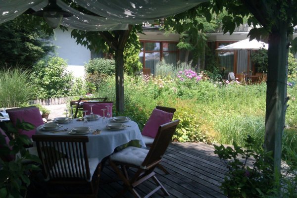 A magas fákkal (nyírfa, fenyőfa, hamisciprus) és cserjékkel (Kányabangita – Viburnum opulus, Galagonya – Crataegus) körülvett rész a leghűvösebb pontja a kertnek. Ezért is lett itt kialakítva, asztallal és székekkel, egy barátságos étkezőhely. A hűs pihenőhely intimitását növeli, hogy nem fedett, árnyékolásról a vadszőlő gondoskodik, ősszel pedig fantasztikus szín kavalkádot ad elő. Nyáron, amikor a vadszőlő „szemetel”, akkor egy kifeszített vitorlavászon segít a rend fenntartásában.