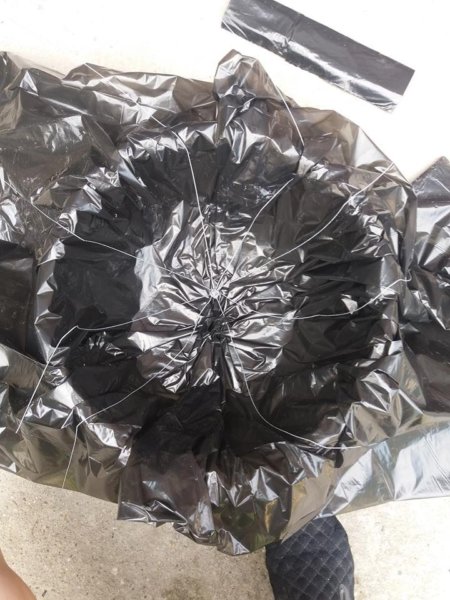 A belső tálon áthúztam az alsó zacskó csücskét, ettől lesz lyuk a tálon. Szöggel szúrtam át hogy ne csússzon ki.