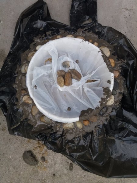 A kész betont belecsurgatom a két tál közé. A belsőbe raktam homokot hogy a beton ne nyomja fel.