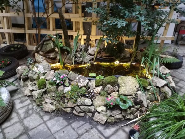 Már az előző bejegyzésben említést tettem a földszinten kialakított tavacskáról, ami szintén közös munkával jött létre.