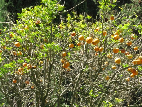 Az utak a szimmetria tengelyén kívül átlós irányúak voltak. A valódi díszkert az épület előtti 1/3 részben volt, ide agyagedényekbe ültetett örökzöld és lombhullató növényeket raktak ki. Ide kerültek a mediterrán kertek alapjai, mint például a citrom, narancs, füge, gránátalma, leander. Elszórtan egy-egy pálma is megjelenik.
