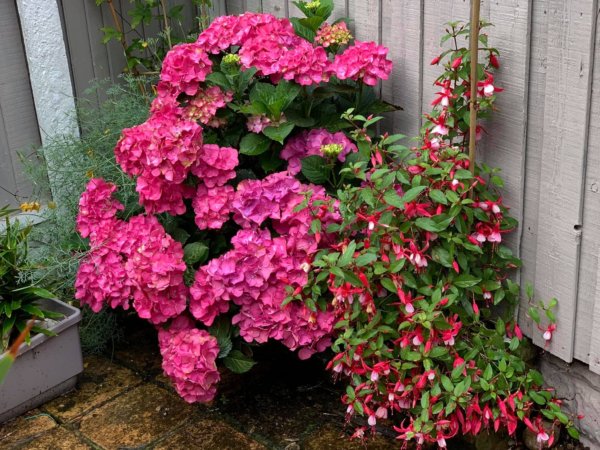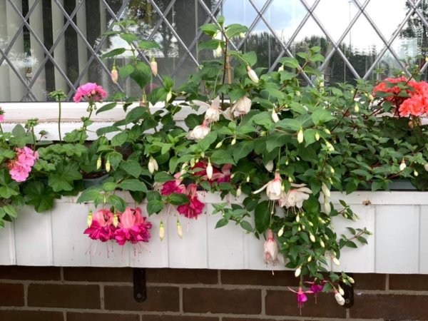 A fuksziák általános tápoldatot kapnak, itt sok esőt is. Ami a képen van az hortenzia tápoldatot is kap, mert bőségesen be szoktam locsolni. Ez félárnyékban van. Elől is vannak ládában, azok csak egész kevés napot kapnak.