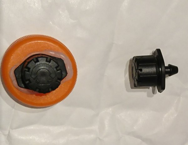Flakon kupakjánál kis szilikonnal tömítettem és maga a csepegtető gomba ilyen. Ez 0-40 l között állítható. Menetes, szét lehet szedni, tisztítható.