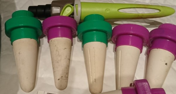 Van még kétféle öntözőnk, ez a párom kicsit költségesebb, de egyszerűbb megoldása. Kerámia kúpok, a növény mellé a földbe kell szúrni, akár 5literes flakont is lehet rá tenni (ha egyezik a menet). A különböző színűek különböző mennyiségben engedik át a vizet. A másik öntözőre sajnos csak normál flakont lehet rakni, de állítható a csepegtetett víz mennyisége.