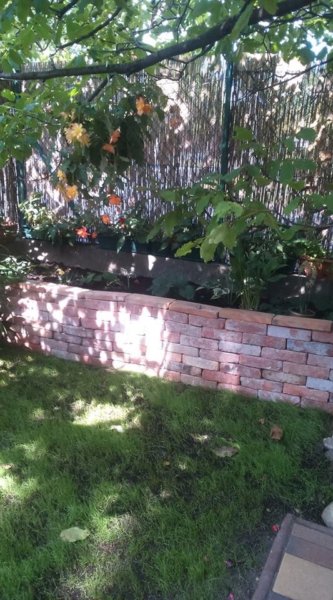 Megmaradt bontott tégla, magaságyásként, ezzel például spóroltam, nem kellett elszállíttatni. Térkövezés és vízvezeték csere volt, ebből megmaradt termőfölddel töltöttük fel, illetve előző évi balkonon használt földdel. Csak egymáson van, de két oldala betonfal, nagyon be van szorítva, meg sem moccan.”