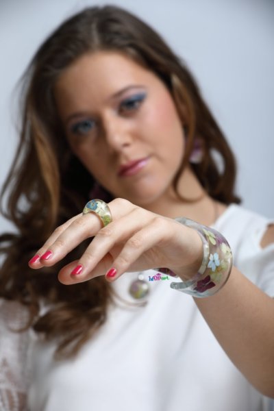 A telefont az ékszerek készítője, Pollák Zsuzsanna vette fel, aki növényi részek és szárított virágok felhasználásával, átlátszó műgyantába öntve kreál egyedi ékszereket.