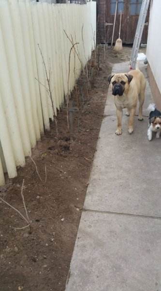 Mi kutyás család vagyunk, 30 év alatt a mostani a harmadik nagytestű kutyus, aki velünk él kertes házunkban. Tél idején bizony néhány helyen keményre tapossa a földet, bár többnyire a kerti tipegőkön, járdán közlekedik… (Füvünk nagy része nyírt ősgyep, kiegészítve strapabíró sportfűvel.) A cserepes virágokat tiszteletben tartja, nem rombol.